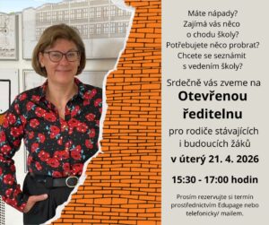 Zároveň vás také zveme na Otevřenou ředitelnu pro stávající i budoucí rodiče. Prosíme o přihlášení prostřednictvím EduPage, telefonicky nebo mailem.