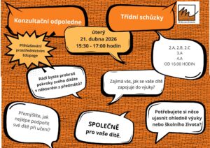 srdečně vás zveme na třídní schůzky a konzultační odpoledne, které se uskuteční v úterý 21. dubna 2026 v době od 15:30 do 17:00 hodin v prostorách školy.